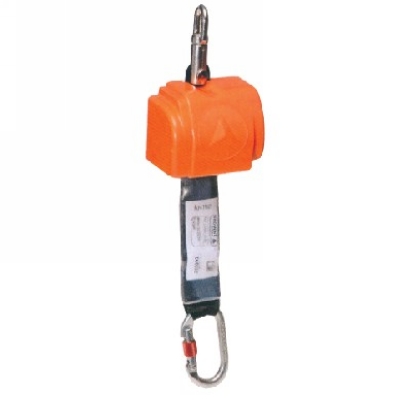 收缩式速差防坠器,配有万向轴,高强度ABS防护外盒,缓冲带宽46mm,最大展开长度2.5m。