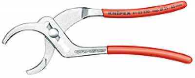 适于松紧塑料管接头,圆接头螺母等,直径范围从25mm至65mm;钳口表面带有细齿;4个位置可供调节钳口大小;配有塑料钳口可保护;安装直径可达60长度230,头部镀铬,塑料套柄