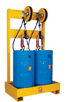 配有: 2个气动油泵(R=3:1bar) 带壁挂功能接油槽 2个10m,R1 1/2” 提油软管卷盘 2个1500mm R1 1/2”油管 2个数显流量计数提油喷嘴