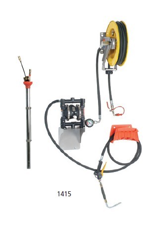 ME1416配有: 支撑柱 气动双动膜片式泵 墙装托架 10m G1/2”软管卷盘 9件导管组套 ?12mm导管 墙装导管架 1.5m G1/2”连接管 4m吸油管